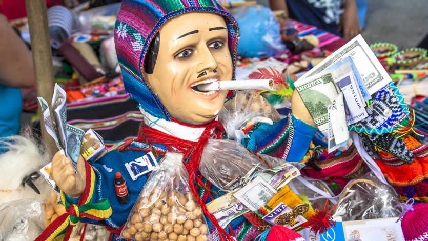Cuando has visitado el mercado en Cusco o una tienda de souvenirs, debes haberlo visto: el Ekeko. El Ekeko es una figura pequeña, parecida a un muñeco, típicamente hecha de cerámica u otros materiales -principalmente un hombre con bigote-, vestido con coloridos atuendos andinos típicos y adornado con todo tipo de bienes: desde comida en miniatura hasta dinero y otros artículos diminutos. como casas, carros, maletas, animales de granja, llamas; todo lo que representa buena fortuna y suerte. El Ekeko es un símbolo de prosperidad y abundancia en las culturas andinas de Perú y Bolivia.